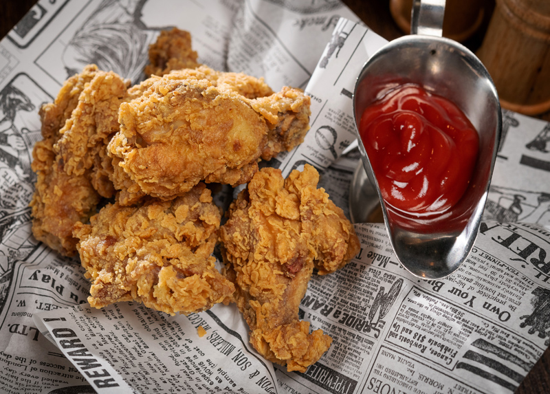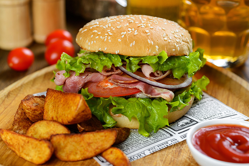 пшеничная булочка с куриной отбивной в хрустящей панировке, подается с картофельными дольками и кетчупом