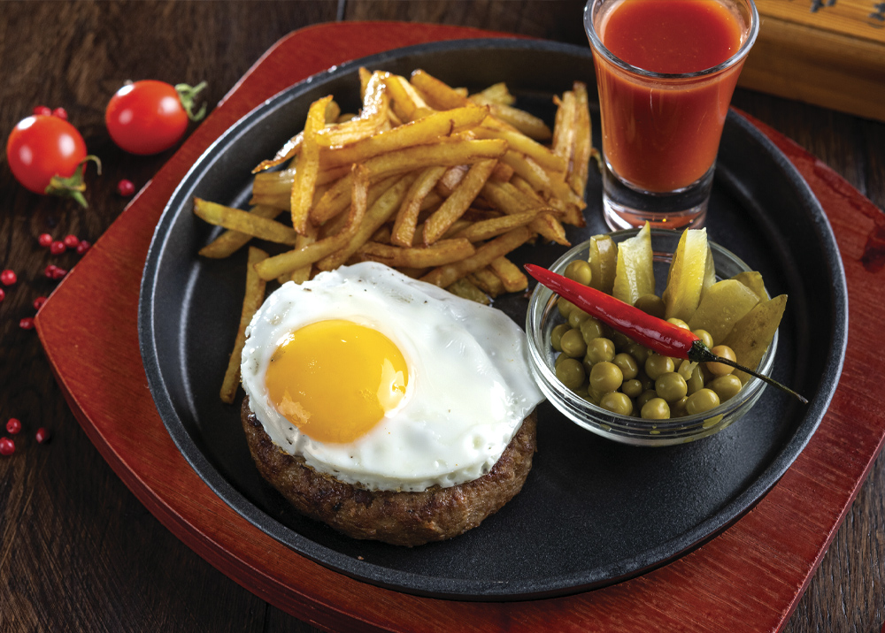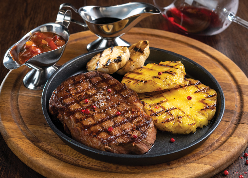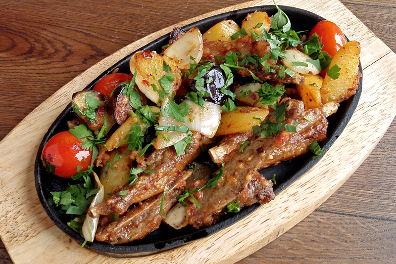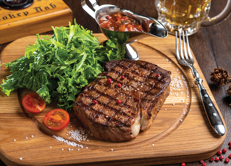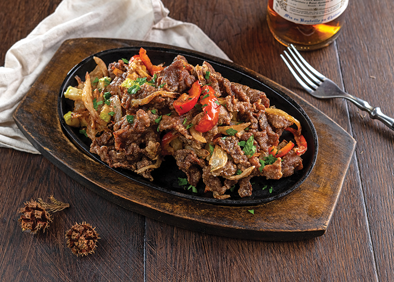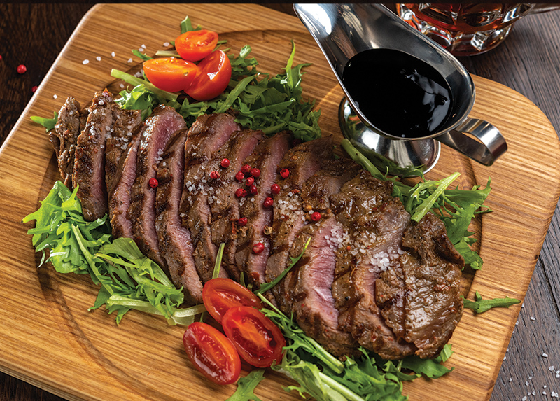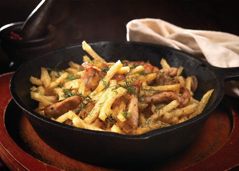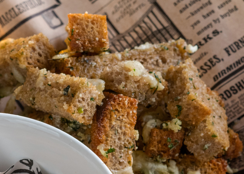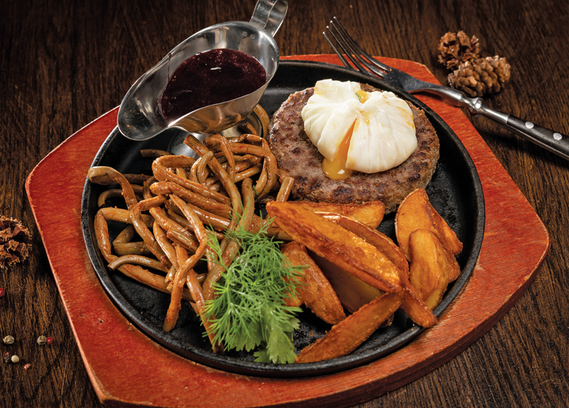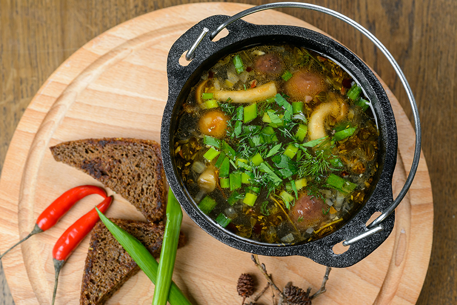 из дикого мяса с лесными грибами и можжевеловой ягодой, подается с чесночными гренками