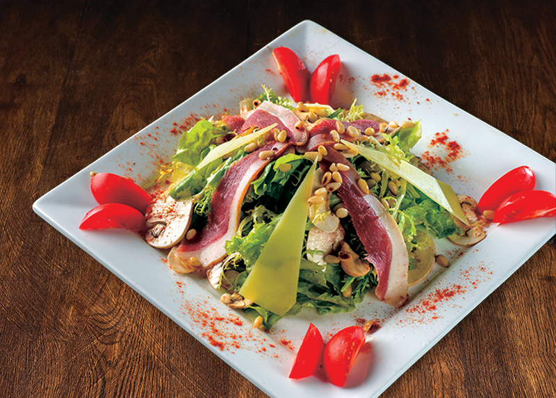 с карамелизированной грушей и кедровыми орешками под бальзамической заправкой