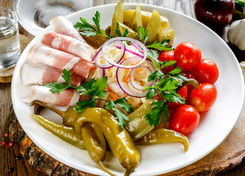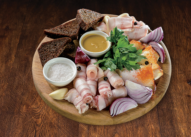 соленое сало, копченое сало, венгерский шпик, бородинский хлеб, лук, чеснок