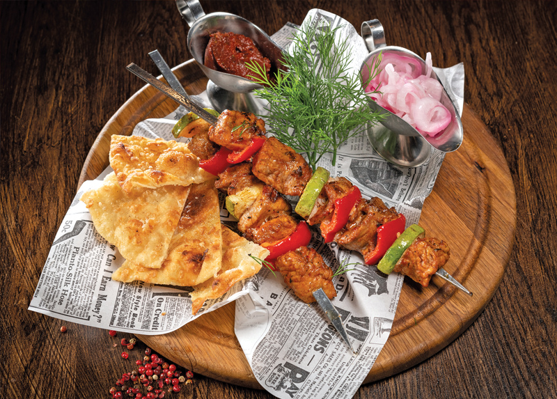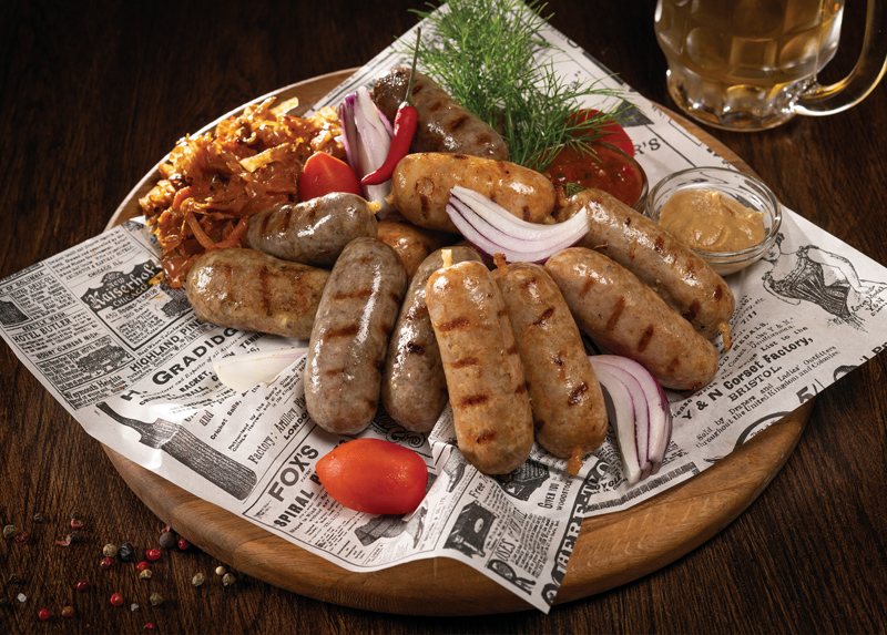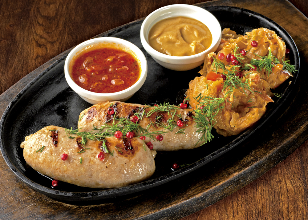 колбаски говяжьи, свиные, куриные, из баранины с тушеной капустой, маринованные перчики, горчица и соус барбекю